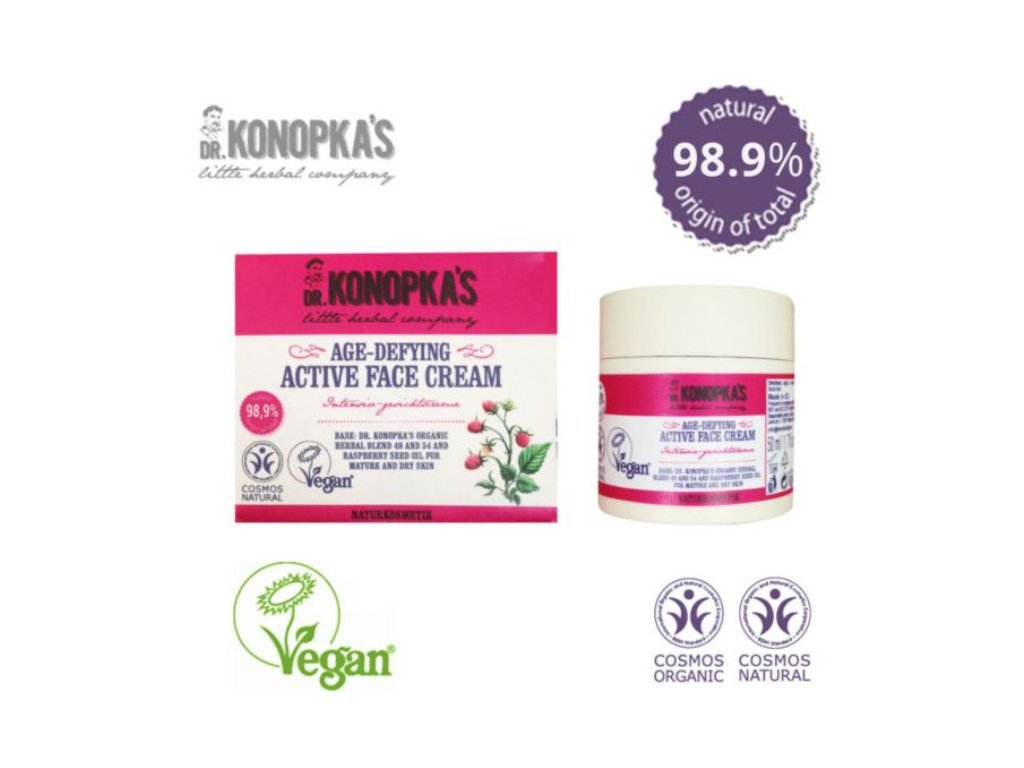 Aktivní pleťový krém proti stárnutí obsahuje speciální bylinné esence Dr. Konopky č. 49 a č. 54. Tyto esence obsahují vitamíny a minerální látky, které poskytují zralé a suché pleti extra výživu a hydrataci. Díky tomu dochází ke zpomalení stárnutí. Malina podporuje regeneraci a obnovu energetické rovnováhy pleti, činí pleť pevnou a pružnou.