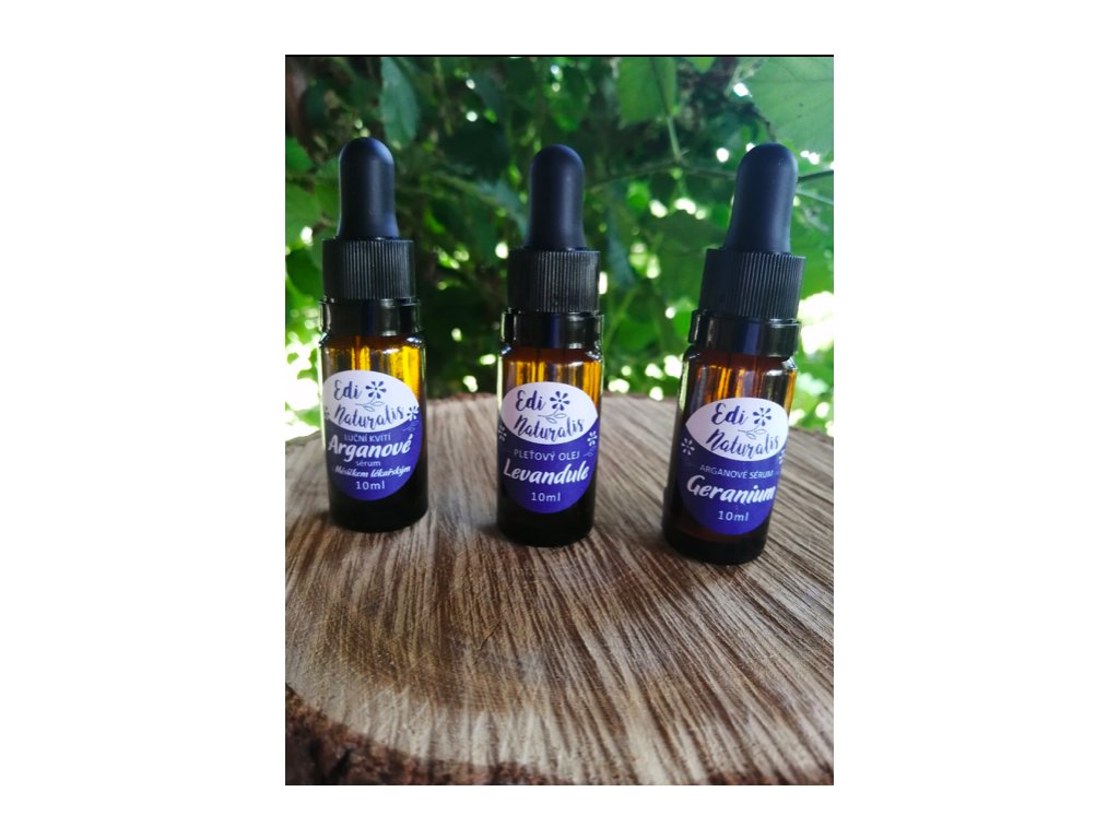 EO geranium: harmonizuje (systém-soustavu) nervovou, svalovou a kožní. Je antibakteriální (Sienkiewicz a kol., 2013), protizánětlivý (Maruyama a kol., 2006), insekticidní (Ali a kol., 2013)… EO lavandula angustifolia: analgetický, protizánětlivý, antialergický, antibakteriální, protiplísňový, antirevmatický, protikřečový, podporuje hojivé procesy a regeneruje pokožku, deodoruje a tonizuje (posiluje a obnovuje vitalitu).