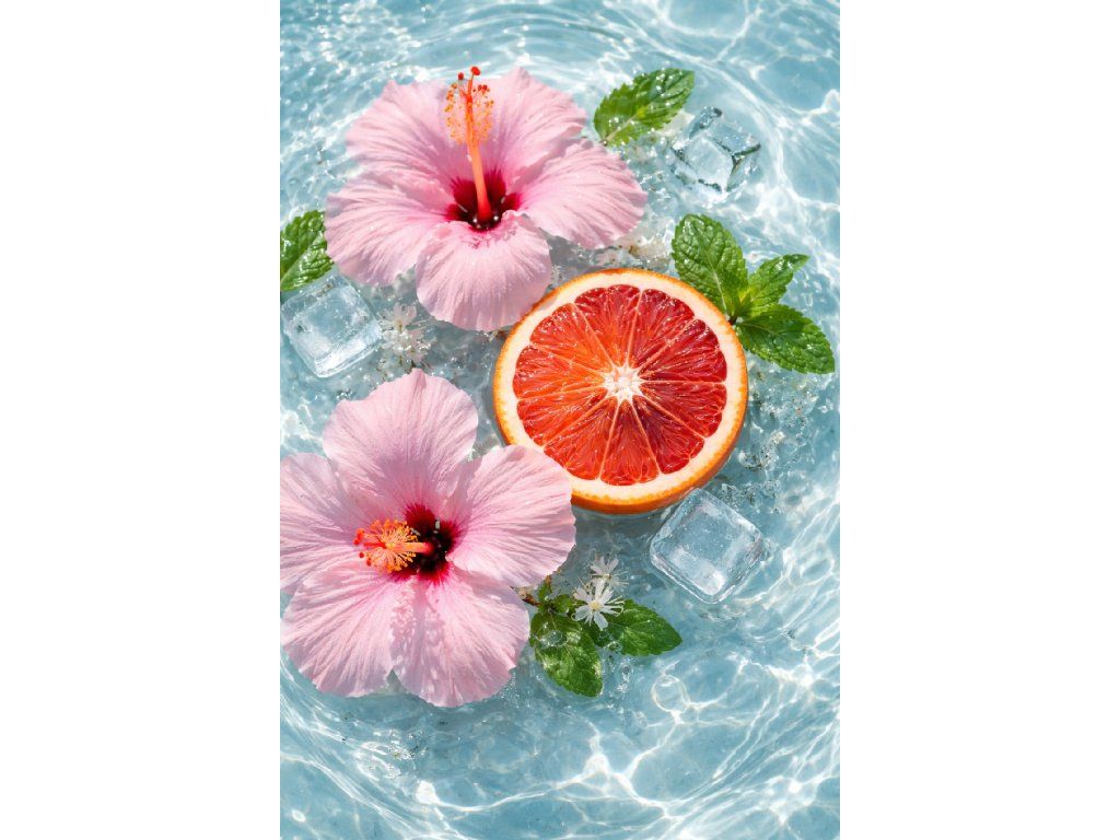 H2O nápoj s obsahem dužiny z červeného pomeranče a ibišku, stévií a vitamíny.
