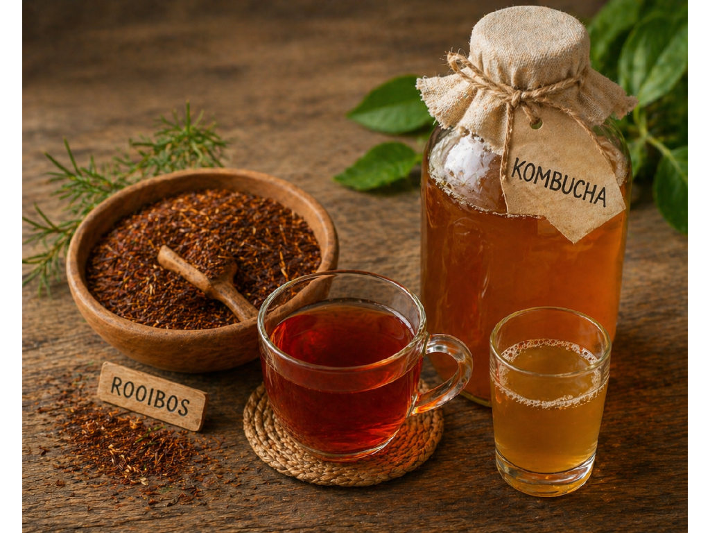 Jemně perlivý fermentovaný čajový nápoj z kombuchy a rooibosu, který mu dává přirozeně zemitou, hladkou chuť. Díky rooibosu je tato varianta bez kofeinu, takže se hodí i na večerní popíjení. Unikátní způsob fermentace, který vede k méně výrazné octové kyselosti, a chuť je přístupná i pro ty, kdo s kombuchou začínají. Nápoj je vhodný pro vegany, bez lepku a bez konzervantů, obsah alkoholu je nižší než 0,5 % a obsahuje probiotickou kulturu Bacillus coagulans. Podávejte dobře vychlazené.