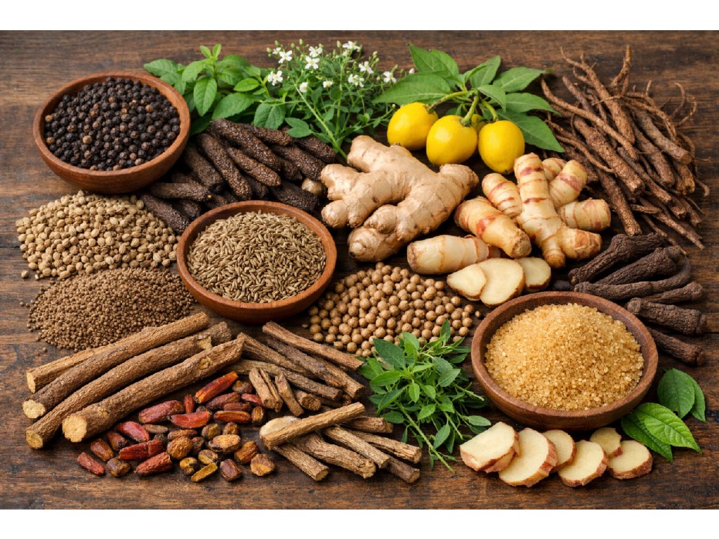 černý pepř (Piper nigrum, plod), dlouhý pepř (Piper longum, plod), římský kmín (Cuminum cyminum, semeno), zázvor lékařský (Zingiber officinale, oddenek), lilek žlutoplodý (Solanum xanthocarpum, celá rostlina), premna herbacea (Premna herbacea, kořen), galgán (Alpinia galanga, oddenek), hedyotis corymbosa (Hedyotis corymbosa, celá rostlina), vyvinutec (Andrographis paniculata, celá rostlina), kmín koptský / ajowan (Trachyspermum ammi, semena), koriandr setý (Coriandrum sativum, semeno), kolumbské dřevo (Berberis aristata, stopka), lékořice lysá (Glycyrrhiza glabra, kořen), vasika lékařská (Adhatoda vasica, kořen), třtinový cukr.