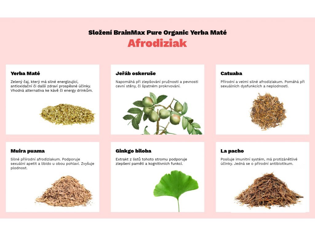 V Jižní Americe bývá Yerba Maté označována jako "nápoj Bohů" a získá si vás lehce hořkou chutí, což je práce saponinů, které Yerba obsahuje. Yerba Maté je v první řadě výborný stimulant. Látky obsažené v Yerbě maté jsou vynikající zdroj energie, které zároveň zlepšují koncentraci. Jelikož mnoho z nás potřebuje denně stimulovat mozek a podpořit mentální výkon, je Yerba vhodná ke každodennímu popíjení. Ve směsi Afrodiziak je yerba maté obohacená o catuabu, bylinu muira puama, jeřáb, ginkgo bilobu a lapacho. Díky tomu nejen povzbudí mysl, ale také fyzickou výkonnost a duševní rovnováhu.