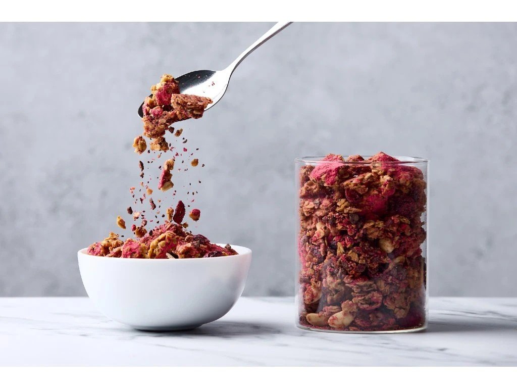 Jemné spojení granoly a prášku z lyofilizovaných malin spolu s hořkou čokoládou je kombinace pro všechny milovníky čokolády a ovoce. Granola je pečená s ghíčkem z BIO mléka a doplněna o BIO brusinky, organická chia semínka spolu s kokosovým sirupem, který granole dává příjemně sladkou chuť. Granolu stačí zalít mlékem, smíchat s jogurtem či tvarohem.