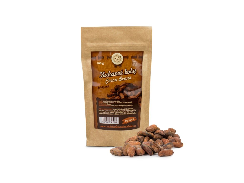 Pražené kakaové boby - jsou křehčí (než nepražené) a mají výraznější chuť a vůni po čokoládě.