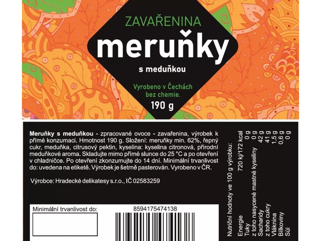 Ručně a šetrně vyráběná meruňková zavařenina s meduňkou v Čechách je bez chemických konzervantů, aromat, lepku, laktózy, ořechů a GMO.