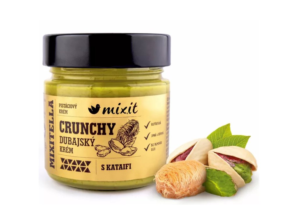 Mixitellu už nejspíš znáte. Tentokrát je ale tady nový sametově jemný pistáciový krém, který je doplněn o křupavé těstovinové nitky kataifi. Výsledkem je exotická dobrota inspirovaná Dubají, která spojuje luxusní chuť pistácií a nezaměnitelnou křupavost.