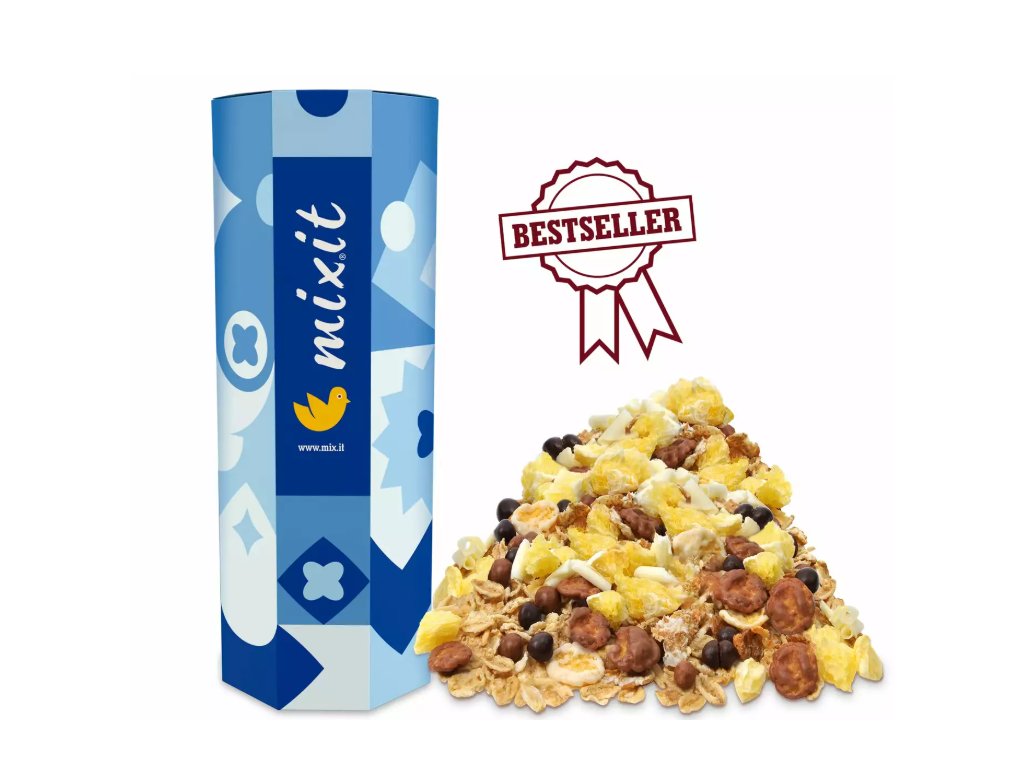 Kukuřičné lupínky v mléčné čokoládě 31 % (mléčná čokoláda 51 % (cukr, kakaové máslo, sušené mléko, kakaová hmota, emulgátor: slunečnicový lecitin), kukuřičné lupínky (kukuřičná krupice, cukr, sůl s jódem, ječný sladový výtažek, uhličitan vápenatý), med, cukr, arabská guma), ovesné lupínky, čokokrispies 14 % (mléčná a hořká čokoláda 66 % (cukr, kakaová hmota, kakaové máslo, sušené mléko, emulgátor: slunečnicový lecitin), přírodní vanilkové aroma), pšeničný extrudát (pšeničná mouka, pšeničná krupice, cukr, jedlá sůl, kakaový prášek), arabská guma, cukr, med), pšeničné lupínky, kávová zrna v hořké čokoládě 10 % (hořká čokoláda 80 % (cukr, kakaová hmota, kakové máslo, slunečnicový lecitin), pražená kávová zrna 13 %, arabská guma, cukr, med), kukuřičné lupínky v bílé čokoládě 7 % (bílá čokoláda 67 % (cukr, kakaové máslo, sušené mléko, sušená smetana, slunečnicový lecitin, přírodní vanilkové aroma), kukuřičné lupínky (kukuřičná krupice, cukr, sůl s jódem, ječný sladový výtažek, uhličitan vápenatý), med, arabská guma, hobliny bílé čokolády 5 % (cukr, sušené mléko, kakaové máslo, přírodní vanilkové aroma, sójový lecitin), lyofilizovaný pomeranč.