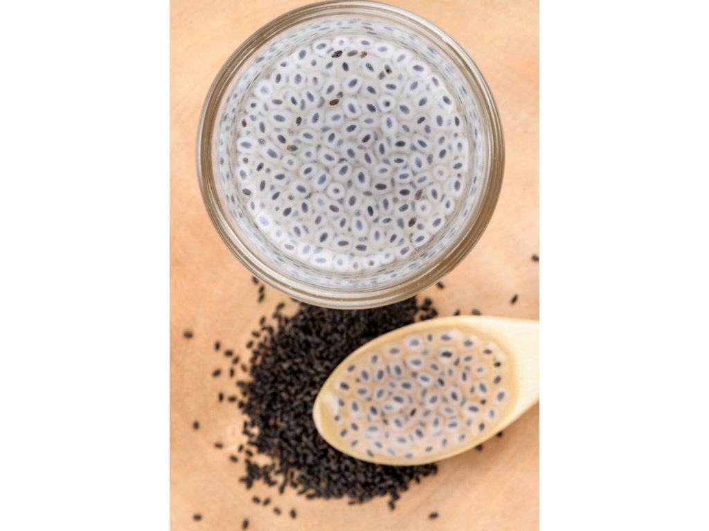 - Semena bazalky sladké zalijte 1/2 sklenice vody a nechte 10–15 minut odstát, dokud nenabobtnají.