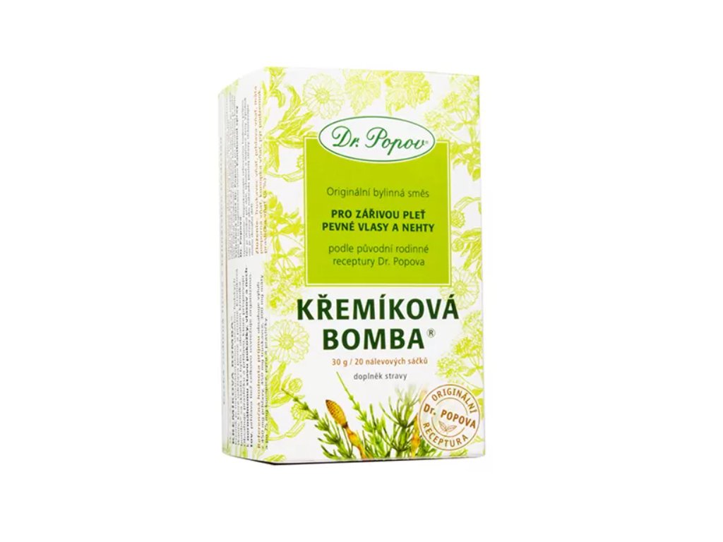 Tato jedinečná bylinná směs v sobě skrývá ty nejlepší zdroje přírodního křemíku. Bylinný čaj Dr. Popova Křemíková bomba® obsahuje vyváženou směs bylin, které přispívají ke zdravému stavu pokožky, vlasů a nehtů (díky přesličce). Kopřiva příznivě působí na zdravý stav kůže a podílí se na jejím hojení. Obsahuje řadu minerálních látek, železo a dodává tělu potřebnou energii i vitalitu a celkově osvěžuje organismus. Truskavec působí díky obsahu stilbenu a resveratrolu antioxidačně.