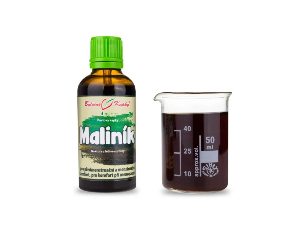 Maliník BIO bylinná tinktura - bylinné kapky - tinktury BIO. Přírodní extrakt z listů léčivé rostliny maliníku obecného pro předmenstruační a menstruační komfort a pro komfort při menopauze. Kód kontrolní organizace: CZ-BIO-002. Tinctura Rubi folium. Tincture Red Raspberry leaf. T1/K1.