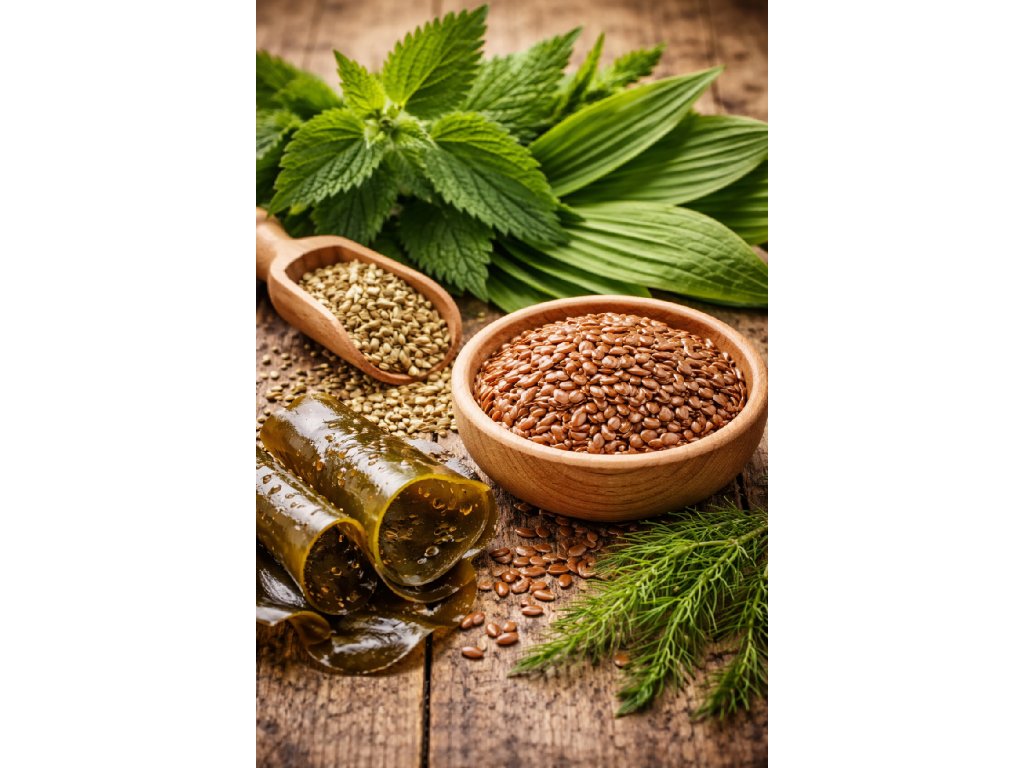 Složení: len setý semeno, kopřiva dvoudomá list, jitrocel kopinatý list, fenykl obecný plod, chaluha bublinatá stélka, přírodní aroma