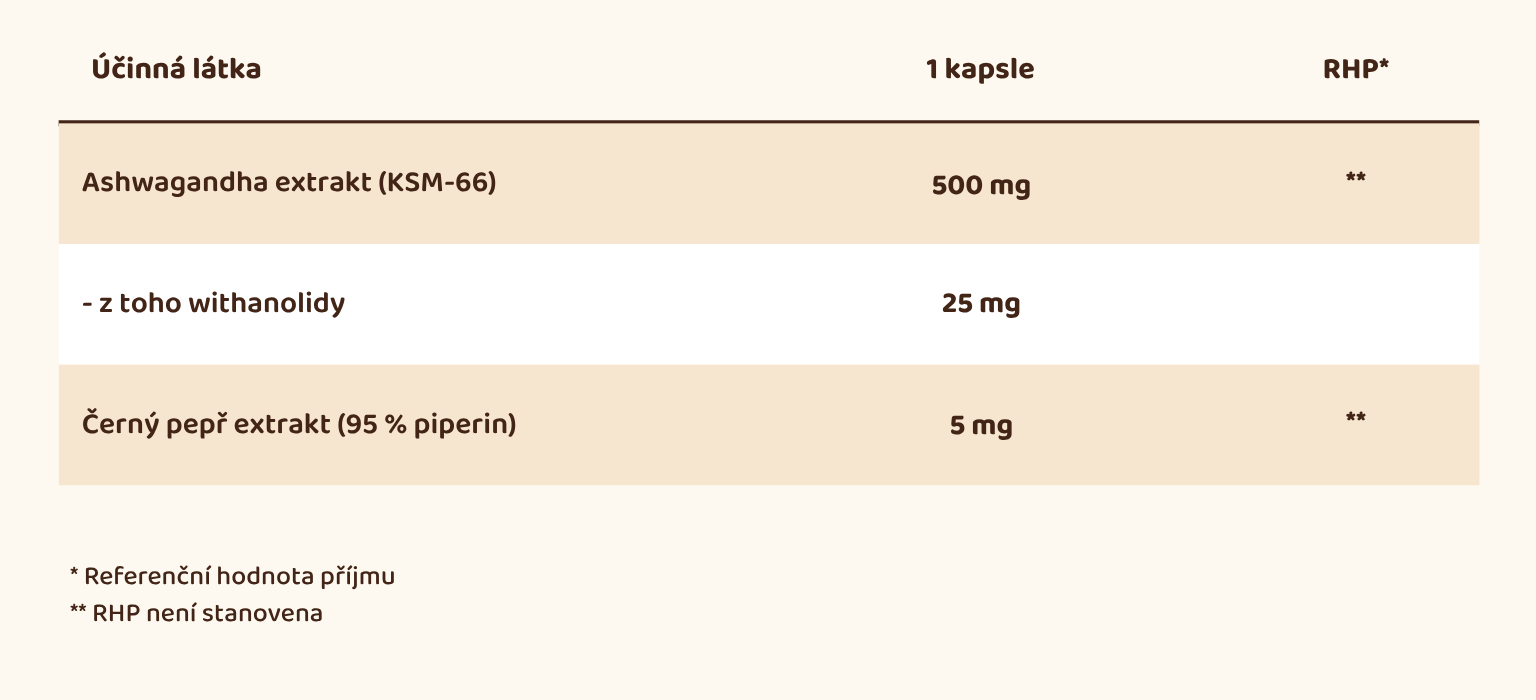 Každá kapsle obsahuje 500 mg KSM-66® standardizovaného extraktu (s obsahem withanolidů ~5 %) a 5 mg piperinu, který zvyšuje biologickou dostupnost a podporuje rychlejší i efektivnější vstřebávání aktivních složek.