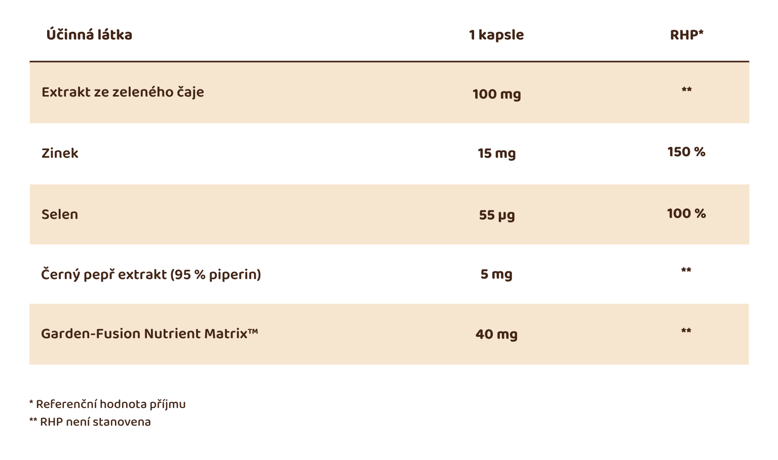 Extrakt ze zeleného čaje Camellia Sinensis, HPMC kapsle, Garden-Fusion Nutrient Matrix™ [směs bio ovoce a bio zeleniny (jablko, červená řepa, brokolice, mrkev, špenát, rajče, zelená paprika, zázvor, česnek, cibule, petržel, květák, kapusta, zelené zelí, růžičková kapusta, okurka, chřest, dýně), himalájský shilajit pryskyřice, probiotikum Bacillus coagulans, prebiotická vláknina galaktomannan, komplex trávicích enzymů (alfa-amyláza, proteáza, laktáza, lipáza a celuláza)], zinek (bisglycinát zinečnatý), extrakt z černého pepře (Piper nigrum) s obsahem 95 % piperinu, selen (L-selenomethionin).