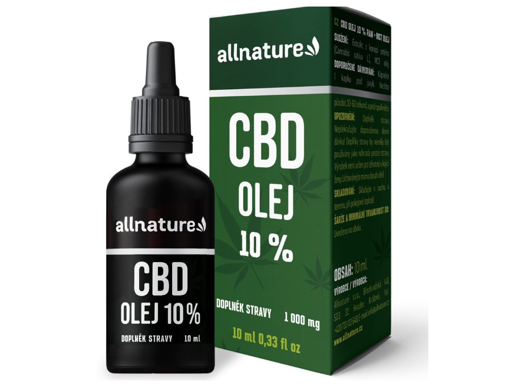 Allnature CBD olej 10% je doplněk stravy s výtažkem z konopí setého v nosném MCToleji. Celá rostlina konopí se vyznačuje obsahem specifických látek, označovaných jako kanabinoidy, podle latinského názvu rostliny – Cannabis. V přípravku je z této skupiny obsažený kanabidiol – zkráceně CBD, který se extrahuje z listů. Použitý MCT olej napomáhá lepšímu vstřebání CBD do organizmu. CBD olej je vhodný pro normální stav pokožky, úpravu krevního tlaku a k podpoře normální činnosti kardiovaskulárního systému.