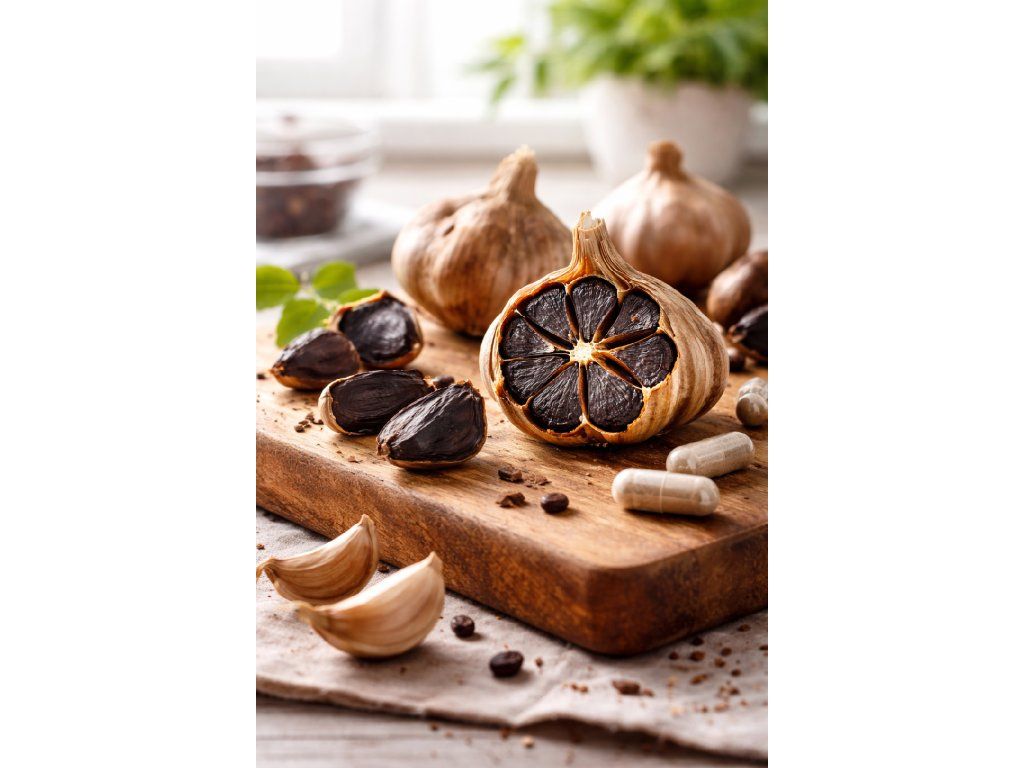 Černý česnek je vpravdě raritou. Jedná se o česnek kuchyňský (Allium sativum), který je umístěn do speciální komory s velmi přesně stanovenou teplotou a vlhkostí, kde po dobu několika týdnů fermentuje, čímž získá svoji typickou černou barvu. Proč to všechno? Fermentace jej zbaví nepříjemného odéru a palčivé chuti. Černý česnek nedráždí sliznice zažívacího ústrojí. Přirozeně pomáhá udržovat normální hladinu cholesterolu a tuků v krvi. Dále podporuje normální funkci srdce a cév a pomáhá při pocitech těžkých nohou. Působí rovněž jako antioxidant a posiluje imunitní systém. Každá kapsle tohoto doplňku stravy představuje 1 stroužek čerstvého (bílého) česneku.