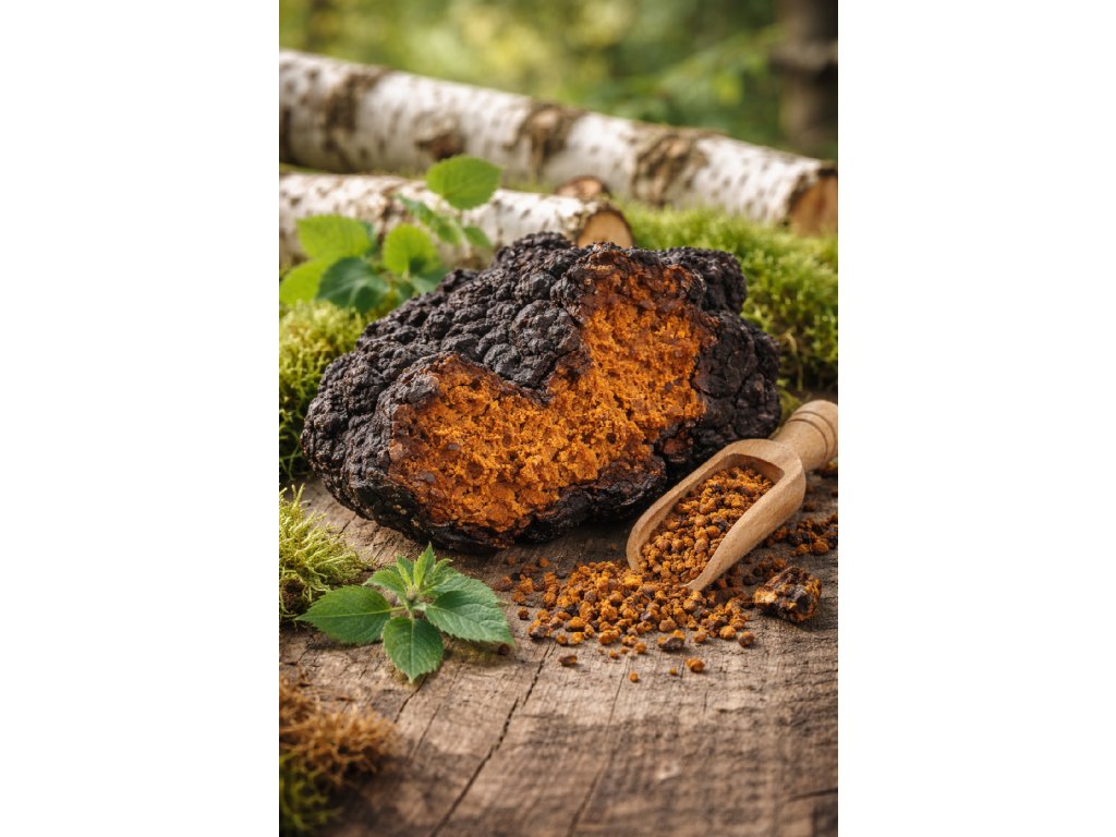Čaga neboli také Rezavec šikmý je houba, rostoucí hlavně na břízách v lesích Sibiře a Laponska. Bříza má silnou vitální energii a čaga z ní čerpá řadu živin – beta glukany, polysacharidy, vlákninu a aminokyseliny. Má tonizující účinek na organismus projevující se povzbuzením enzymatických funkcí.