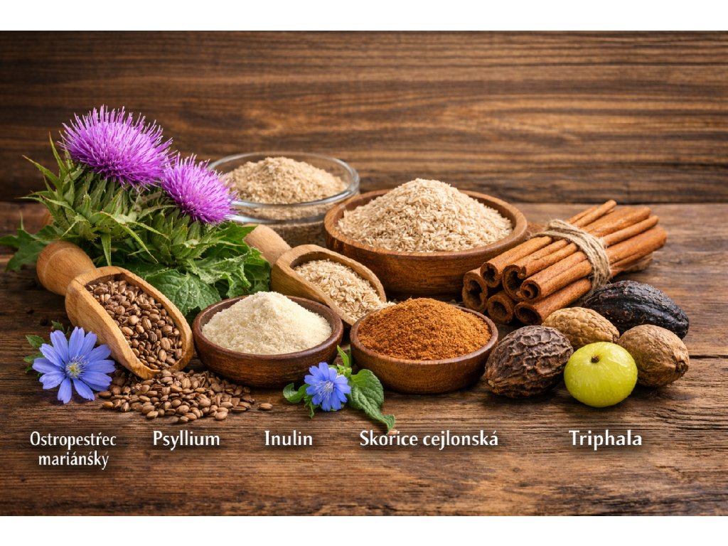 Složení: Ostropestřec mariánský (Silybum marianum, Původ: EU), Inulin - vláknina z čekanky (Cychorium intibus, Původ: EU), Psyllium (Plantago ovata, Původ: Indie), Cejlonská skořice (Cinnamon zeylanicum - verum, Původ: Sri Lanka), Triphala - Haritaki, Amalaki, Vibhitaki (Phyllanthus emblica, Terminalia belerica, Terminalia chebula, Původ: Indie)