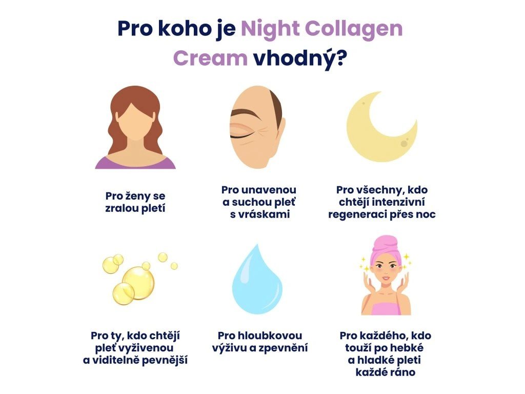 Noční krém s kolagenními tripeptidy (500 Da) a hedvábným proteinem v luxusní variantě. Regeneruje pleť během spánku, obnovuje pevnost, hydrataci a dodává hedvábnou hebkost.