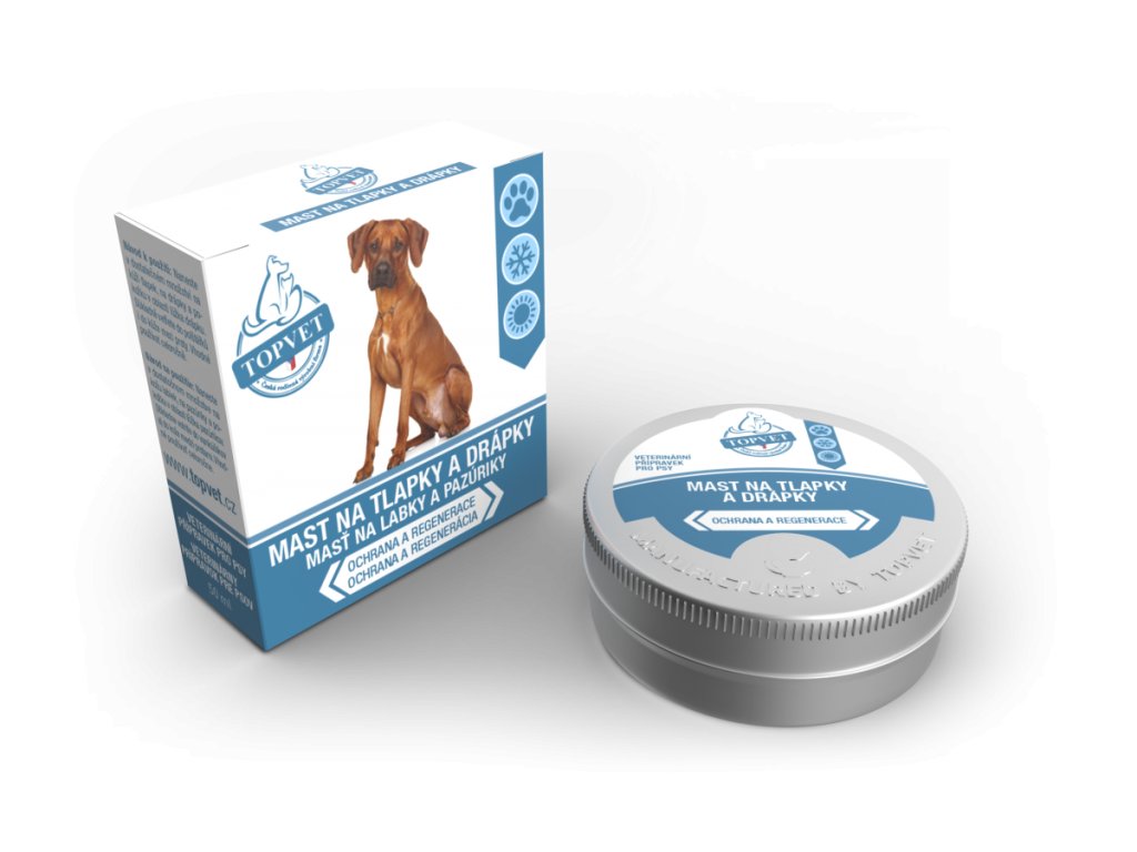 Mast na tlapky a drápky Topvet je luxusní prostředek k preventivnímu ošetření kůže tlapek, drápků a jejich lůžek. Mast vykazuje místní ochranný účinek proti nepříznivým vlivům prostředí, zejména proti vlivu soli, posypových materiálů, dráždivých látek uvolňujících se z horkých asfaltových povrchů chodníků a vozovek, nadměrné vlhkosti, prachu, bláta, cizorodých látek aj. Mast optimálním způsobem vyživuje, regeneruje a hojí drápky a jejich lůžka. Snižuje lomivost a třepivost drápků, zvyšuje jejich elasticitu a pevnost.