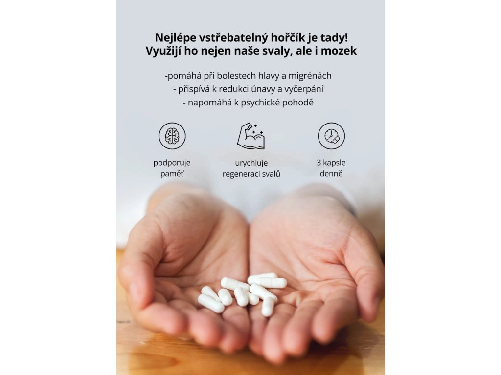 - obsahuje 320 mg hořčíku ve formě bisglycinátu obohaceného o vitamin D3 a B6