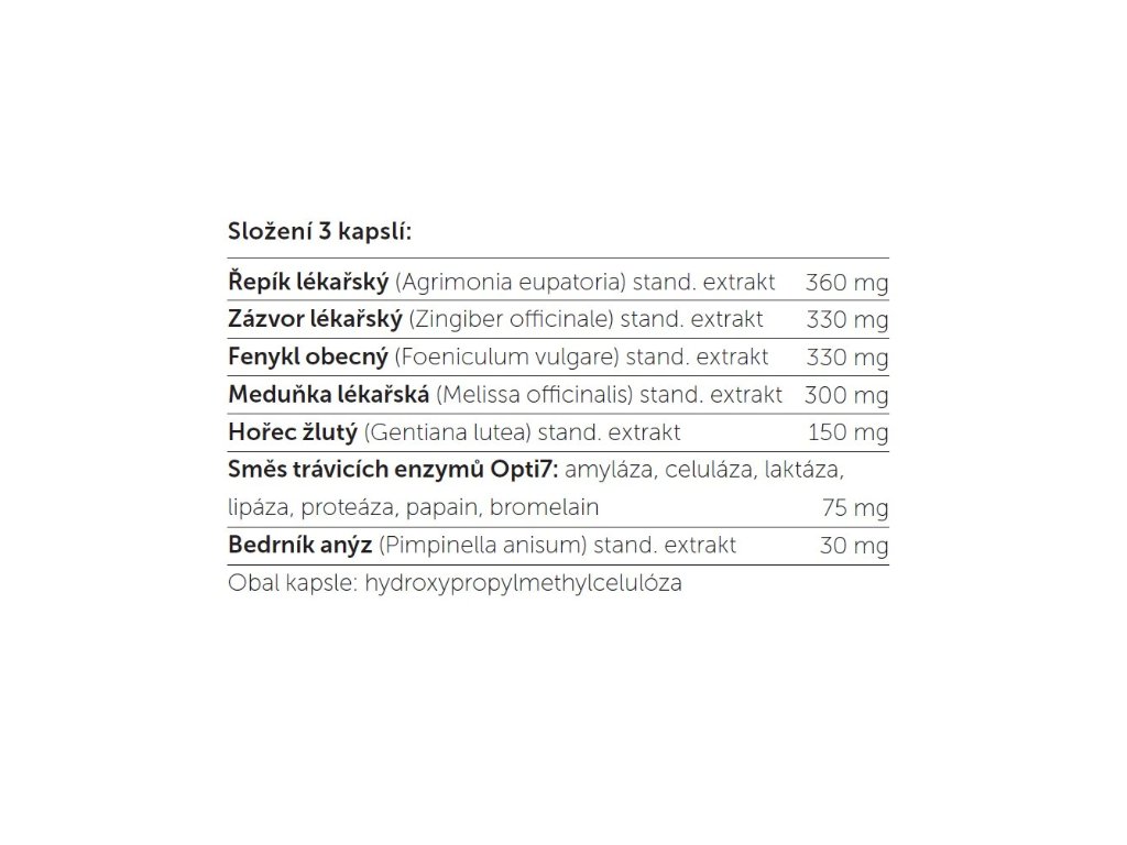 Řepík lékařský (Agrimonia eupatoria) stand. extrakt, Zázvor lékařský (Zingiber officinale) stand. extrakt, Fenykl obecný (Foeniculum vulgare) stand. extrakt, Meduňka lékařská (Melissa officinalis) stand. extrakt, Hořec žlutý (Gentiana lutea) stand. extrakt, Směs trávicích enzymů Opti7: amyláza, celuláza, laktáza, lipáza, proteáza, papain, bromelain, Bedrník anýz (Pimpinella anisum) stand. extrakt