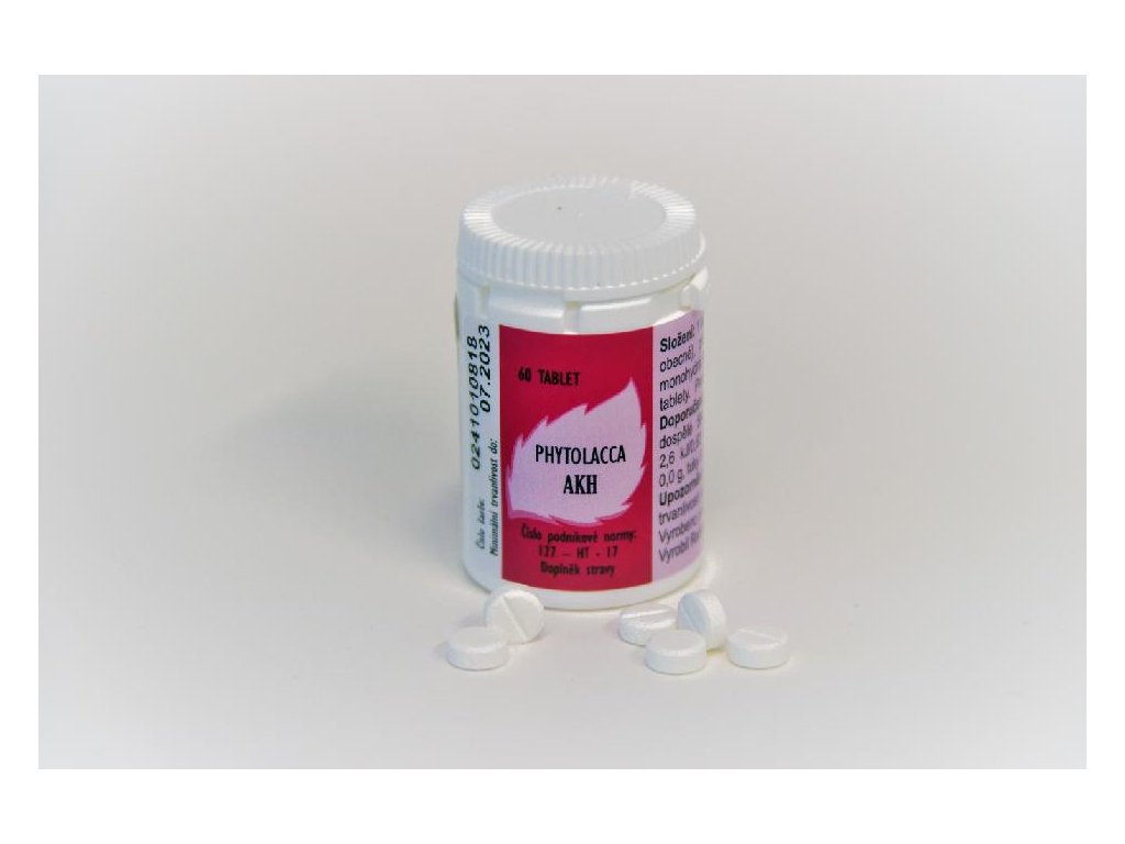 Složení: 1 tableta obsahuje 99 pg Phytolacca decandra (líčidlo obecné), protispékavá látka - magnesii stearat 0,0028 g, monohydrát laktózy 0,136 g a rýžový škrob 0,012 g – součást tablety.