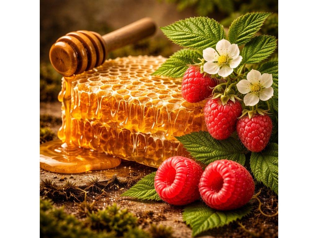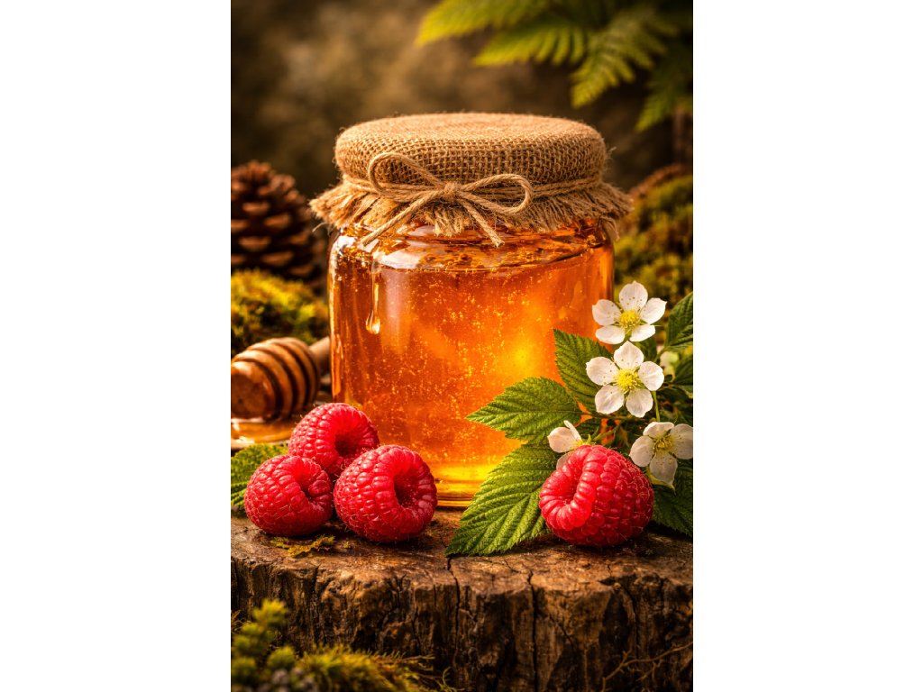 Med květový lesní s maliníkem má silnou aromatickou chuť lesního medu zjemňuje příměs medu z květů maliníku, který včely sbírají na lesních pasekách.