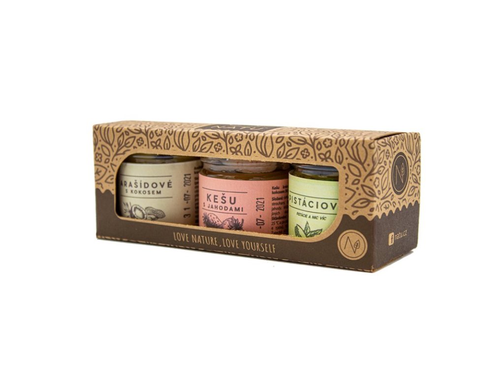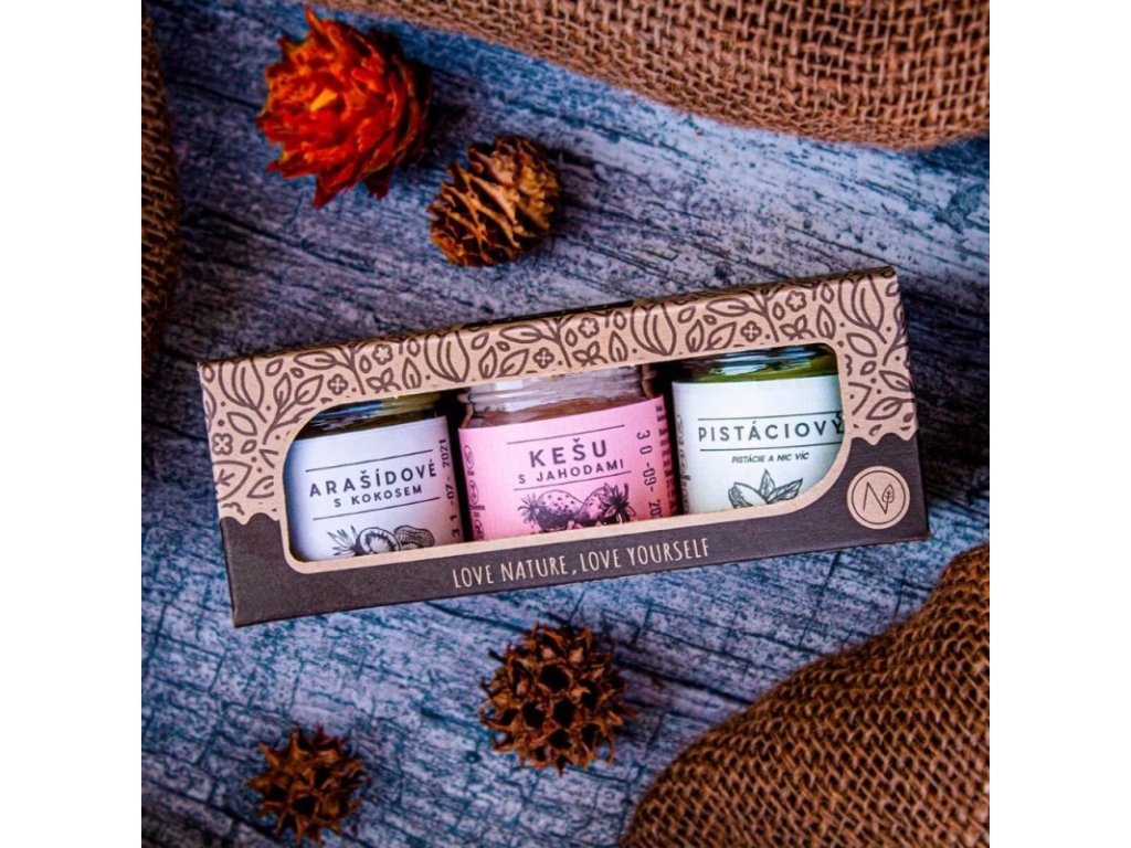 Objevte tři mini ořechová másla v dárkové krabičce – arašídy s kokosem, kešu s jahodami a pistácie. Sladká ochutnávka v přírodní kvalitě.