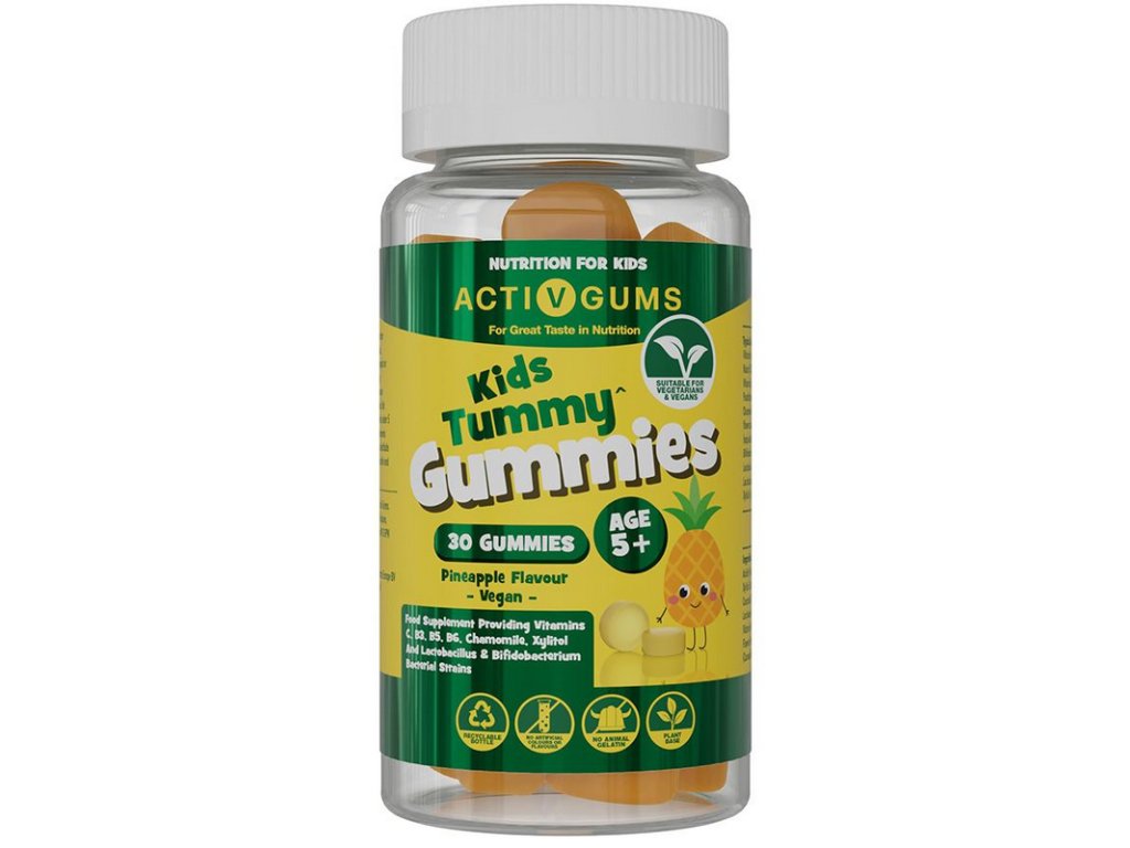 Vitamínová želé pro naše nejmenší nemusí být plná umělých sladidel a barviv! Jde si pochutnat i bez syntetických látek. Želé ActivGums® Kids Tummy mají lahodnou přírodní příchuť ananas a lehce se konzumují. Dětem dodávají tři druhy probiotik, extrakt z heřmánku a vitamíny B3, B5, B6 a C. Všechny tyto složky nabízí jedinečný účinek, který souvisí s klidným zažíváním.