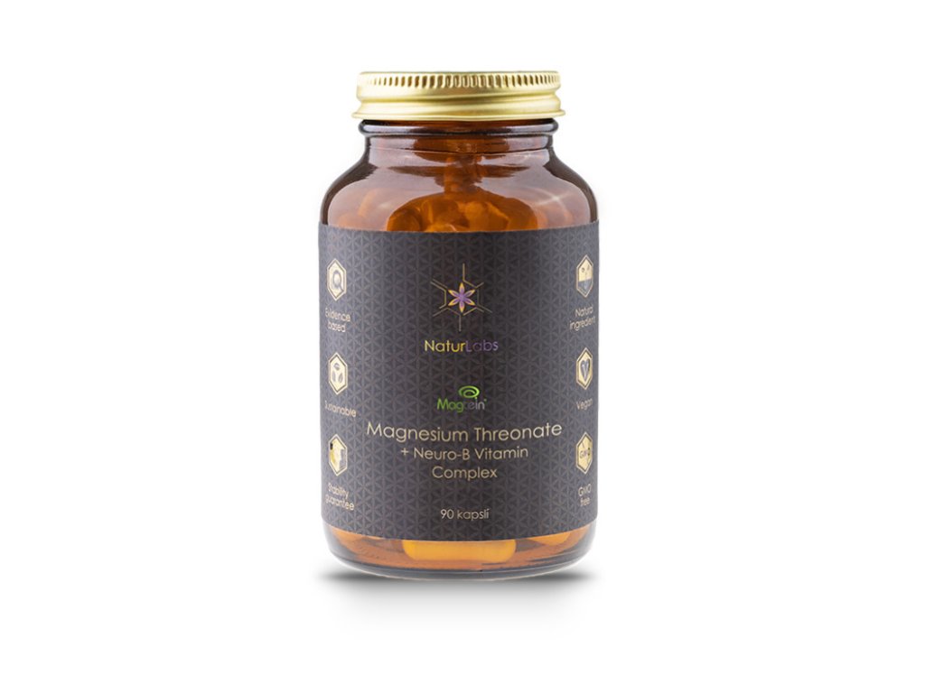 Složení: MAGTEIN® Magnesium L-Threonate, Neuro-B Complex (thiamin hydrochlorid, riboflavin, niacin, pyridoxal-5-fosfát, methylcobalamin).